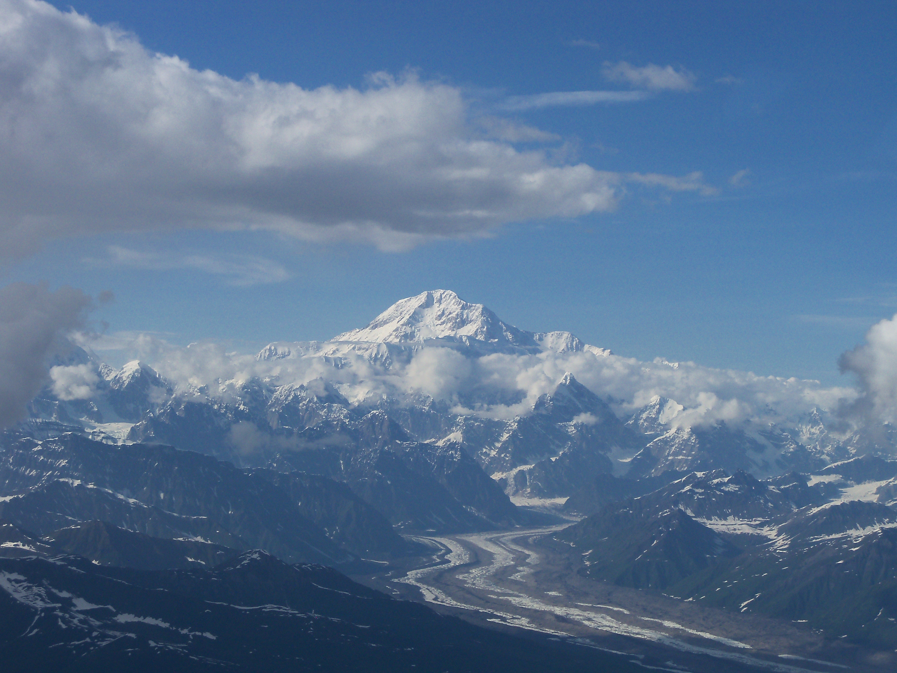 McKinley has a summit elevation of 20,320 feet (6,194 m) above sea level, making it the highest peak in North America. Measured from base to peak, it is also the world’s tallest mountain on land. McKinley sits atop a sloping plain with elevations from 300 metres (1,000 ft) to 900 metres (3,000 ft), for a base-to-peak height of 5,300 to 5,900 metres (17,000 to 19,000 ft). (Mount Everest, on the other hand, sits atop the Tibetan Plateau at a much higher base elevation. Base elevations for Everest range from 4,200 m (13,800 ft) on the south side to 5,200 m (17,100 ft) on the Tibetan Plateau, for a base-to-peak height in the range of 3,650 to 4,650 metres (12,000 to 15,300 ft). However, McKinley’s base-to-peak height is little more than half that of the 10,200 meters (33,500 ft) of the volcano Mauna Kea, which lies mostly underwater.)
