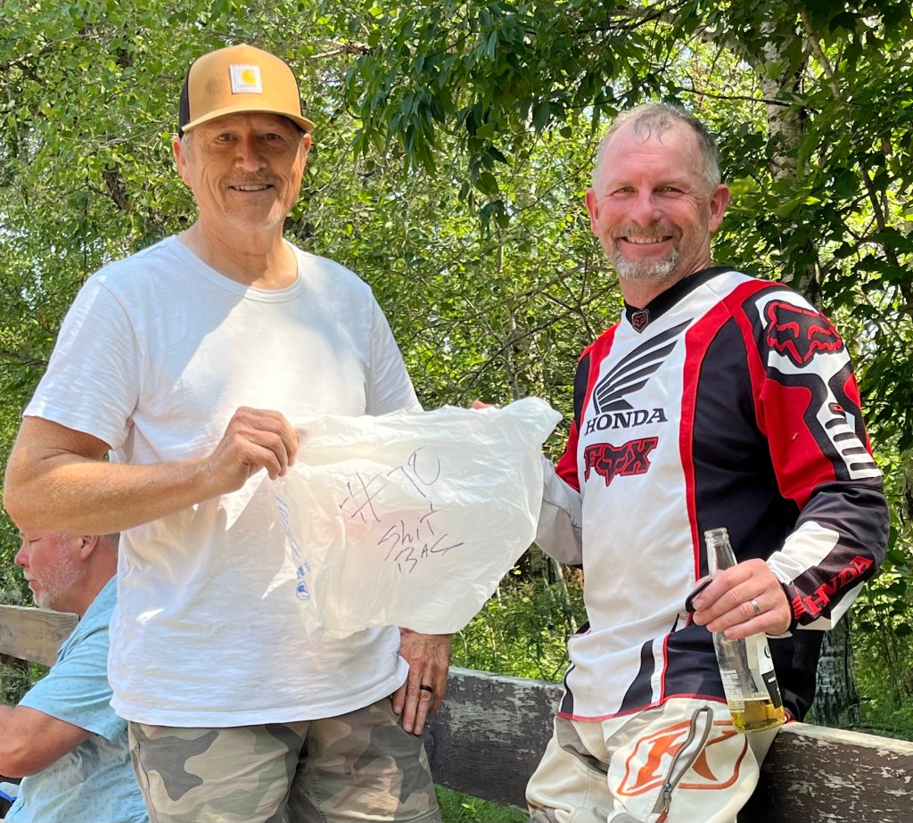 Toward the end of the ride, we were all stopped at a trail marker with about two miles left to go. That’s when Spanky casually announced that Jim (aka Asshole) had to poop—and had taken off like he’d been shot out of a cannon to hit the outhouse before his moto gear turned into a hazmat situation.